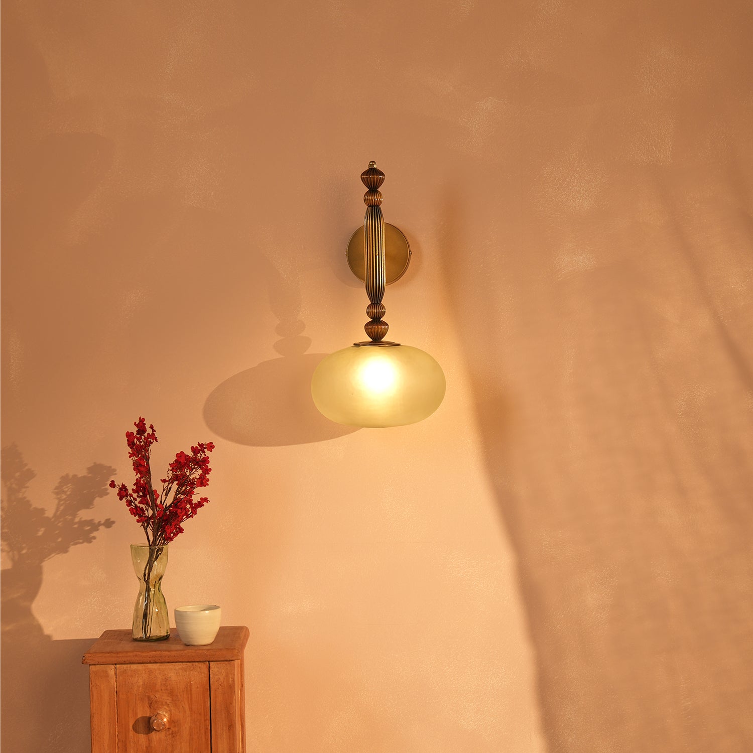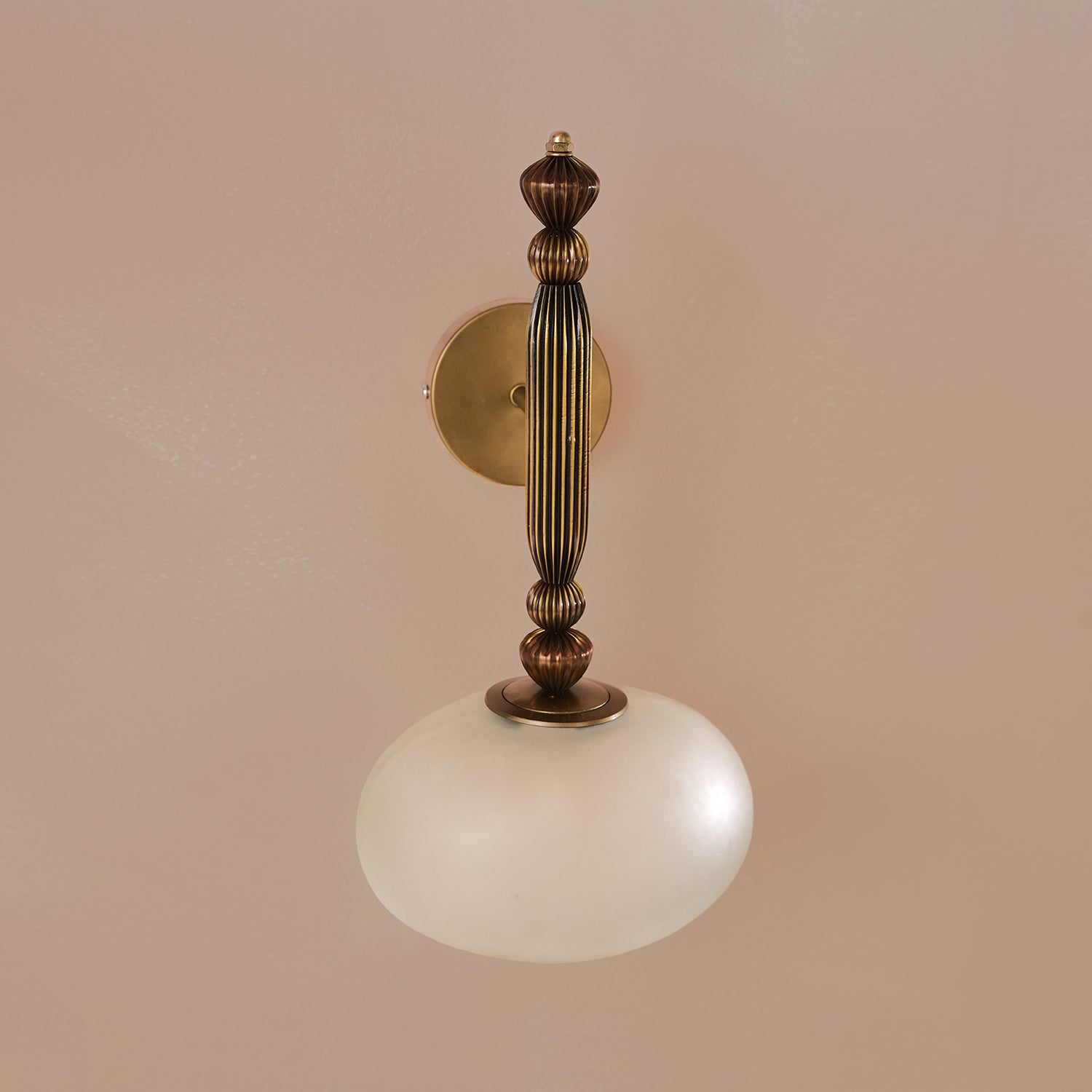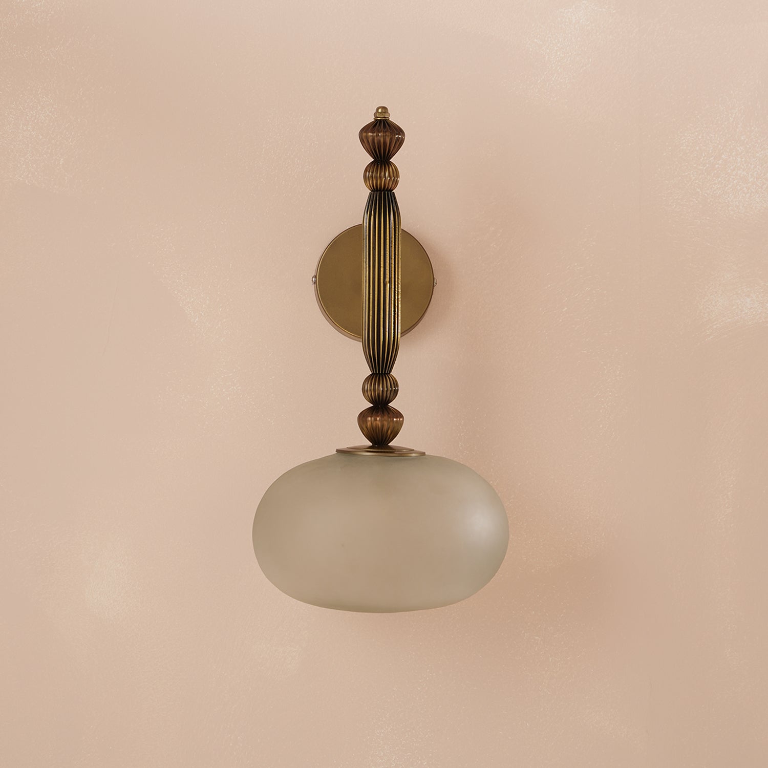 On the wall, this lamp rests like a fleeting vision here, then almost gone. Antique brass frames frosted glass in an embrace of quiet grace. It glows softly, a memory anchored to the present. Poetry in the language of light.